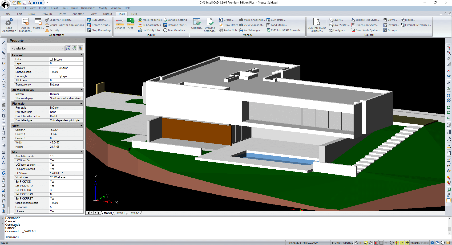 O CMS IntelliCAD permite que você crie desenhos 3-D facilmente usando as ferramentas de desenho em 3D. Você pode exibir versões com faces ocultas, sombreadas de seus modelos 3-D ou suas bibliotecas 3-D existentes com um clique de um botão.