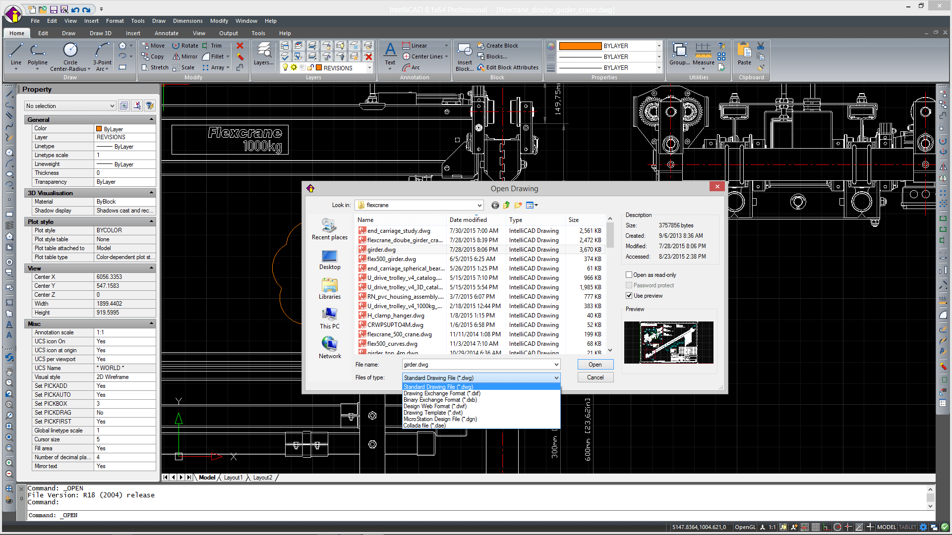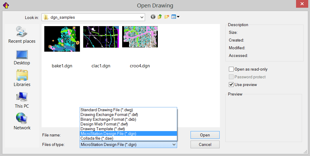 Como o CMS IntelliCAD é capaz de importar arquivos em formato DXF, DXF, DWF, DWG e DAE, também pode importar arquivos de formato Bentley MicroStation *.DGN convertendo-os em arquivos .dwg.
